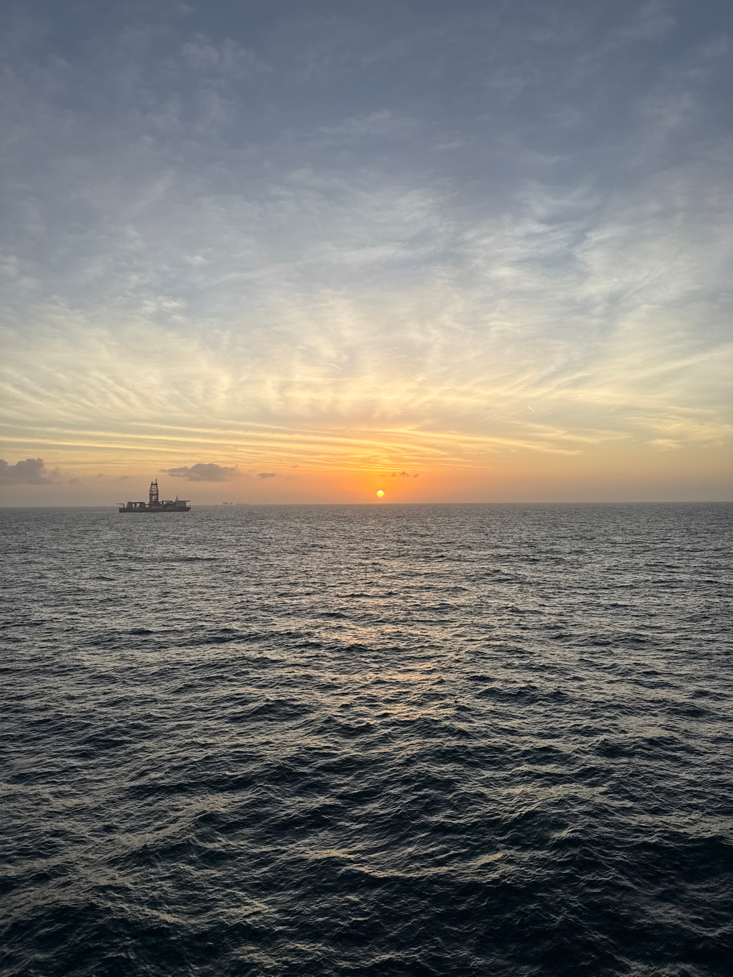 The image shows a sunset over the ocean, with a ship or oil platform visible on the horizon. The sky has wispy clouds, and the water is choppy. The location is unknown.