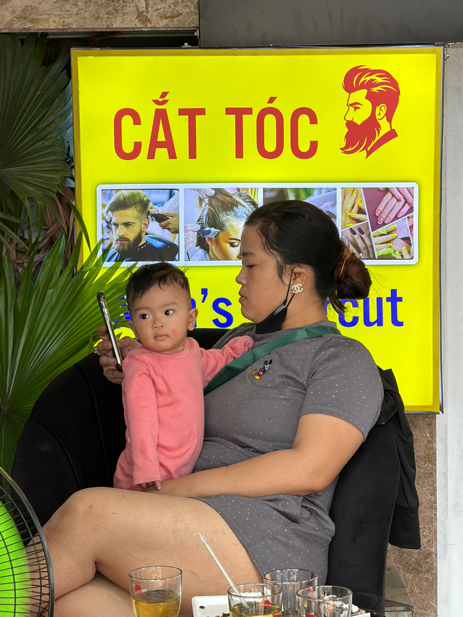 A bright daylight scene captures a woman and a baby seated outdoors in what appears to be a cafe or street-side establishment in Đà Nẵng, Vietnam. The woman, wearing a grey polka-dotted top and dark b…read more