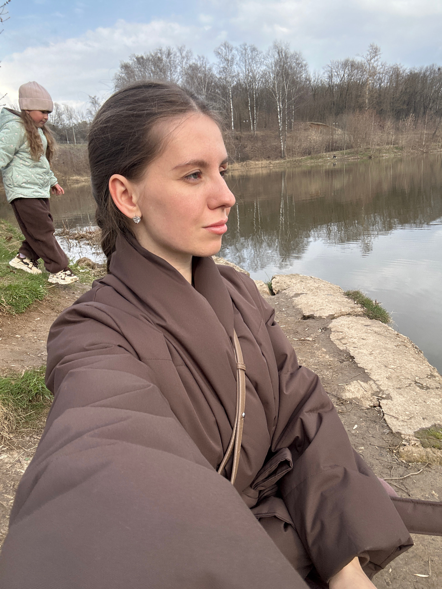 The image captures a woman in a brown puffer jacket sitting outdoors. A body of water is visible behind her, reflecting trees without leaves. A small, unpaved path runs alongside the water. To the lefβ¦read more
