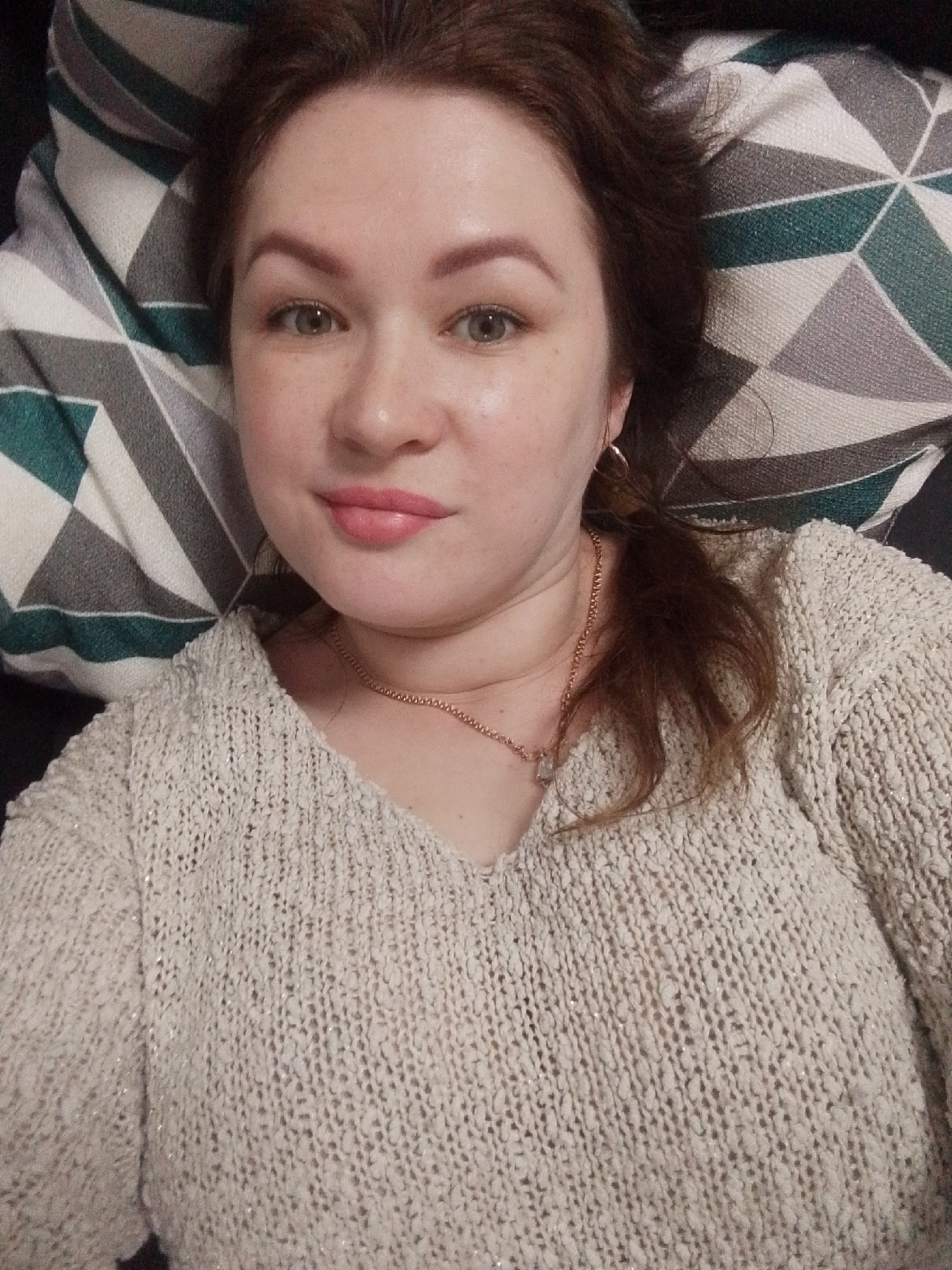An adult woman is depicted in a close-up, head-and-shoulders selfie, positioned as if lying down or reclining, and looking directly at the camera. She has light skin, brown hair, and light-colored eye…read more