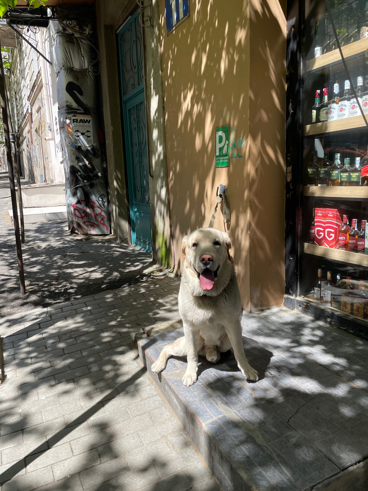 A friendly-looking white dog, possibly a Labrador Retriever, is the central subject of this outdoor image. The dog is resting on a raised stone step or curb, looking up towards the camera with its mou…read more