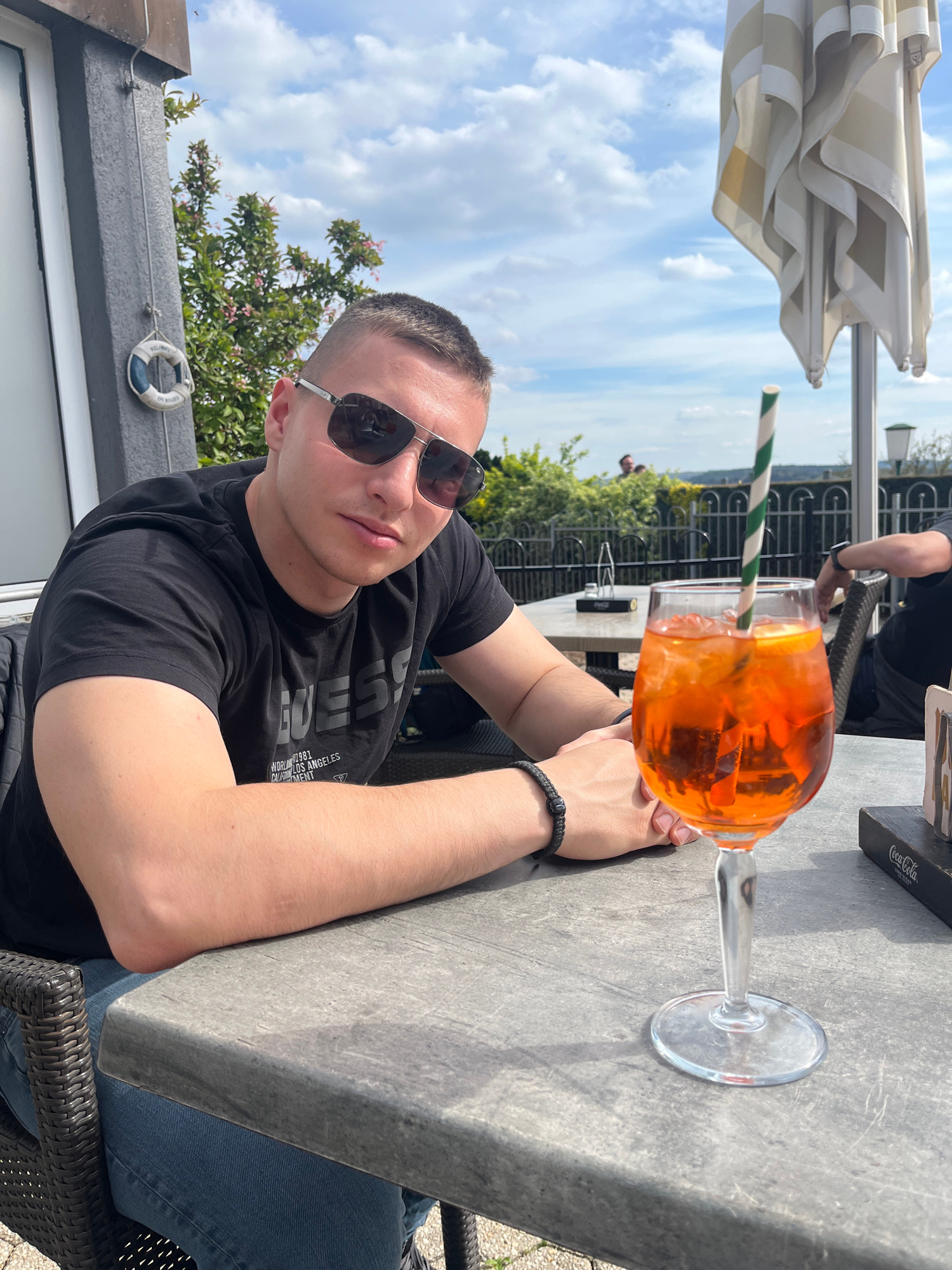 A man wearing sunglasses and a black t-shirt sits at a table in Saarburg, Germany. A glass of orange liquid with a green and white striped straw sits on the grey table next to his hands. A partially o…read more