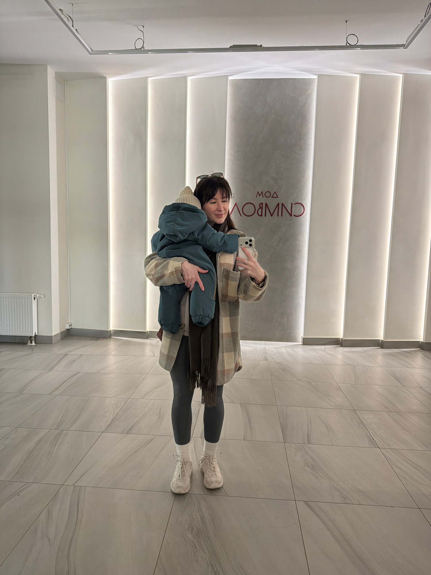 A woman is holding a child and taking a selfie in a modern interior. The woman is wearing black leggings, white socks, and off-white sneakers. She is also wearing a beige and brown plaid coat and hold…read more