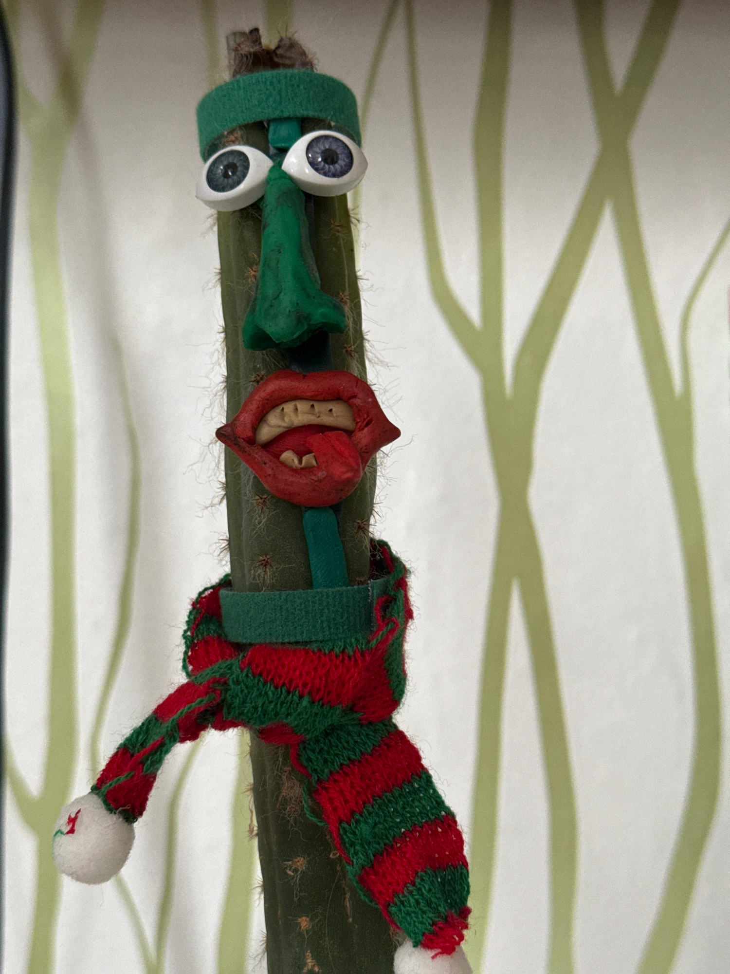 A green cactus is horizontally oriented in the foreground against a backdrop of a white wall with green striped wallpaper. The cactus is decorated with several items: two googly eyes attached with a g…read more