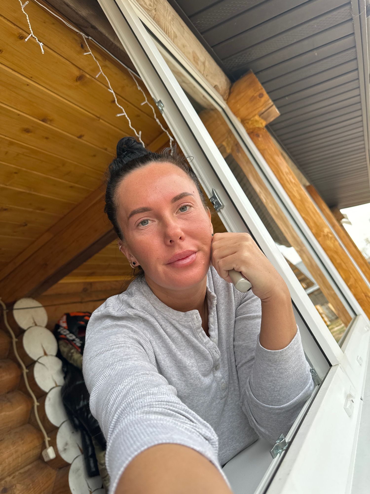 A woman with dark hair pulled back in a bun, wearing a grey long-sleeved shirt, is visible from the chest up, looking directly at the camera. Her right hand is near her face, holding the white handle…read more