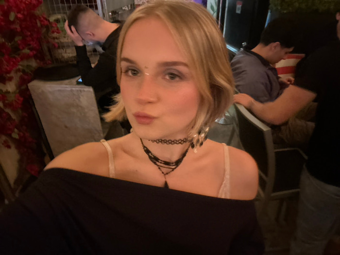 This image depicts a nighttime or evening scene within a casual indoor or patio establishment in Vancouver, Canada. The primary subject, a light-skinned individual with short blonde hair, is centered…read more