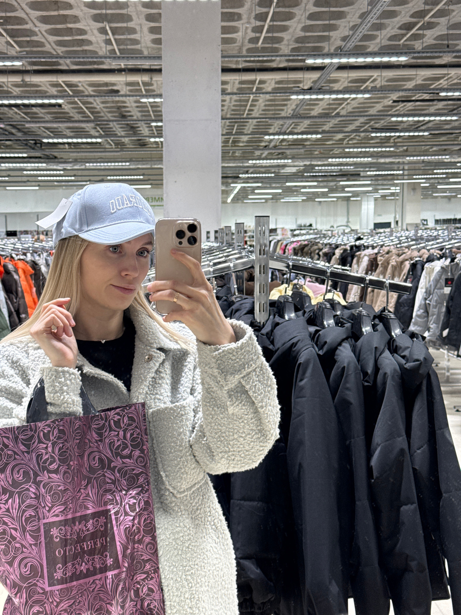 The photograph shows a woman with blonde hair and blue eyes, wearing a light blue baseball cap and a white, textured jacket. She is holding a beige smartphone in her right hand, presumably taking a se…read more
