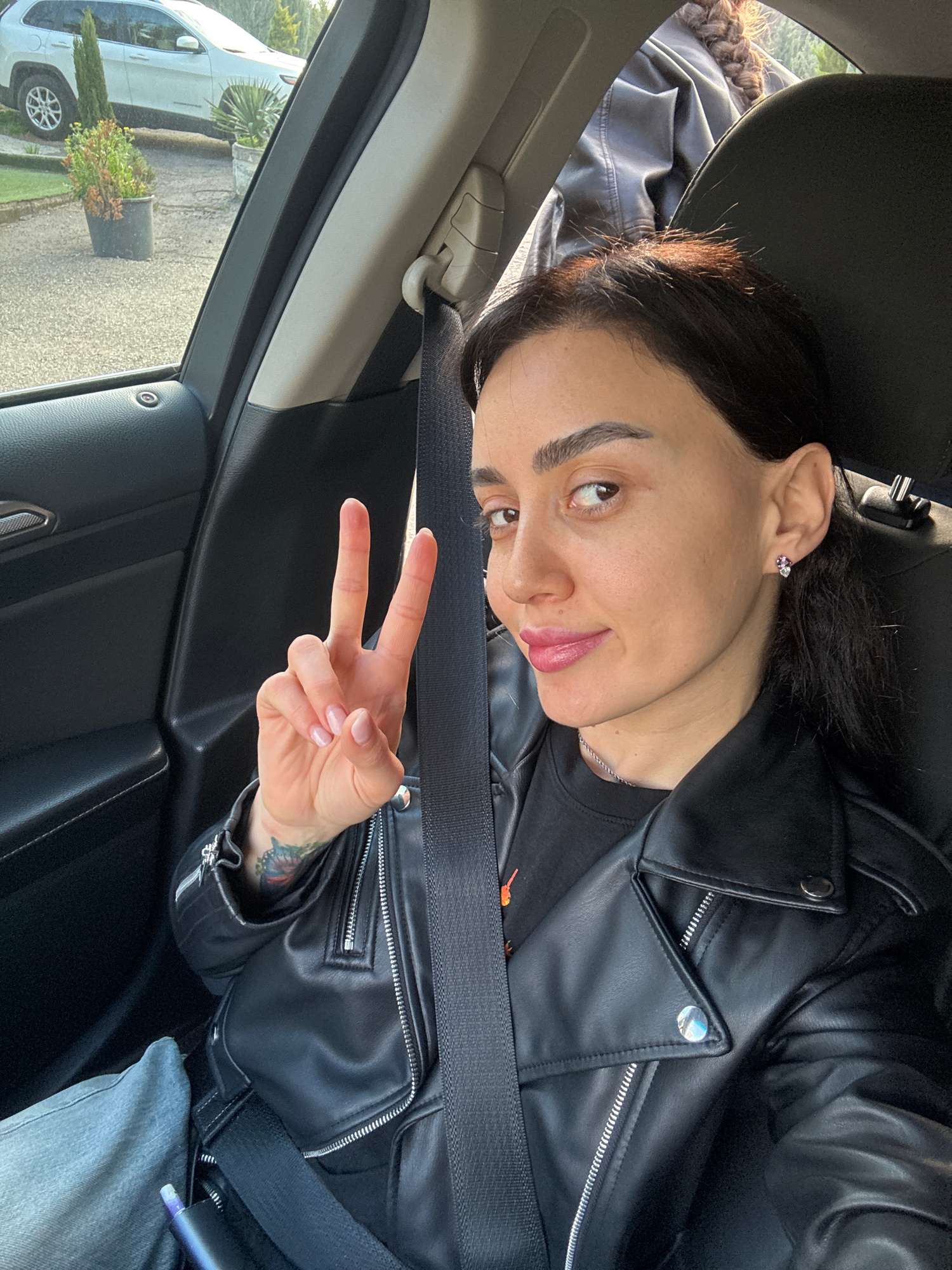 A person is inside a vehicle, wearing a black leather jacket and jeans. The person is making a peace sign with their right hand. The person has dark hair and a silver earring on their left ear. The pe…read more