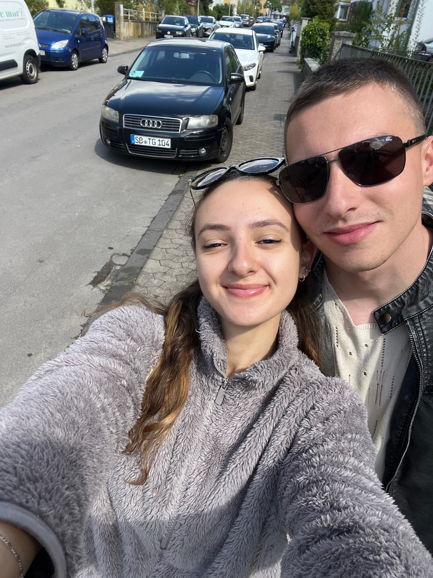 Two individuals are posing for a selfie outdoors in what appears to be a residential or urban area. The female subject is in the foreground wearing a grey fleece jacket and smiling at the camera. Sung…read more