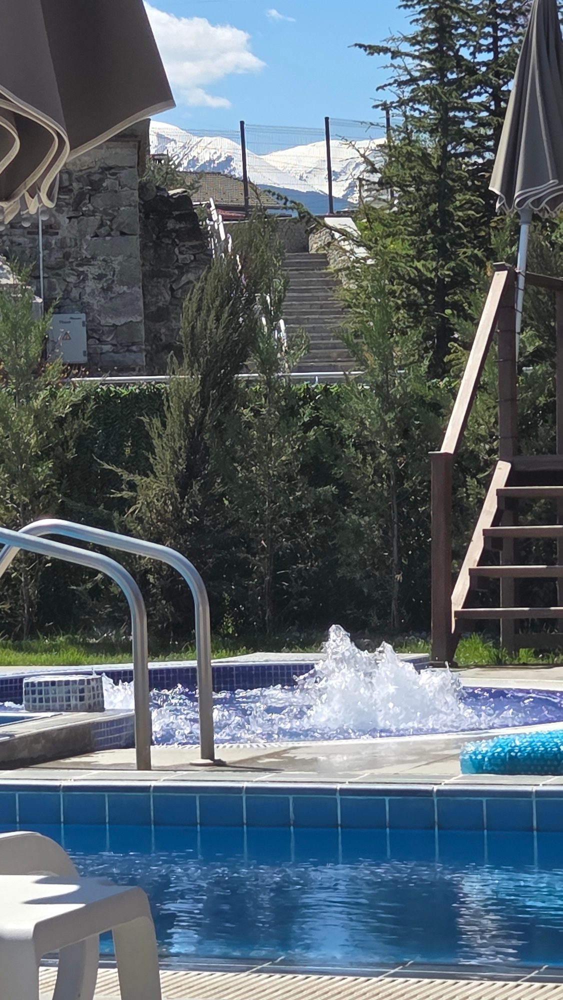 The scene is a brightly lit outdoor setting, presumably during the day, showing a swimming pool in what appears to be the Bulgarian city of Bania. The pool has blue tiles and clear water. Adjacent to…read more