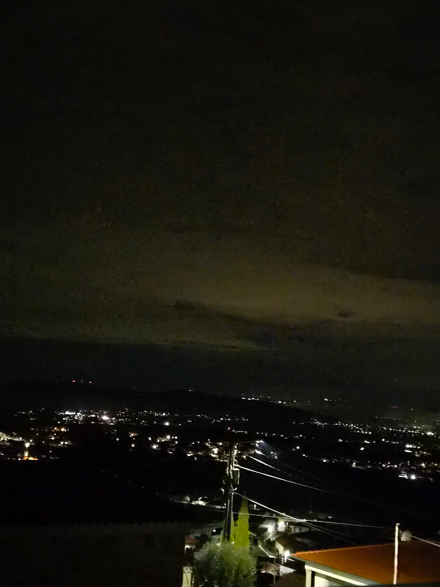 At night, the image shows a body of water, likely the Cávado River, reflecting the lights from the city of Barcelos, Portugal. On the right side, a structure with a red-tiled roof is visible near the…read more