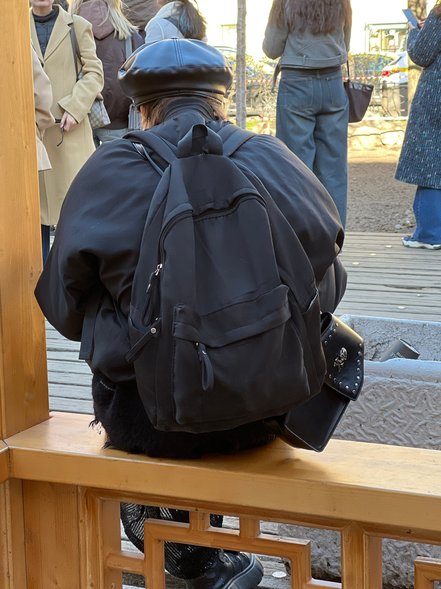 The image captures an outdoor scene in what appears to be a public area in Saint Petersburg, Russia, under bright daylight. The main subject is a person viewed from behind, wearing a black puffer jackβ¦read more