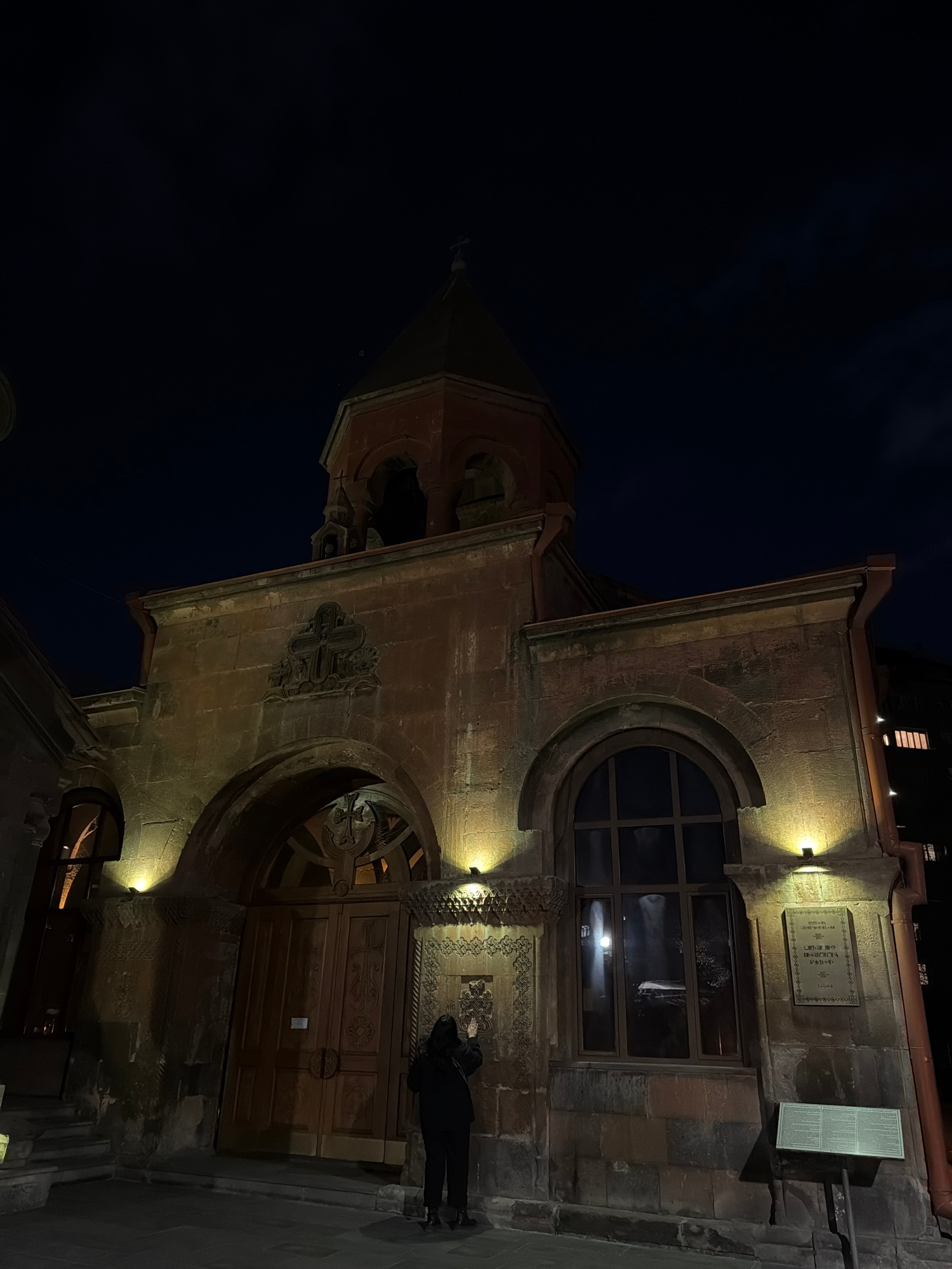 At night, a man stands in front of Saint Anna Church in Yerevan, Armenia. The church's facade is lit by several spotlights. The man is looking toward the church entrance. The sky above is dark. The chβ¦read more