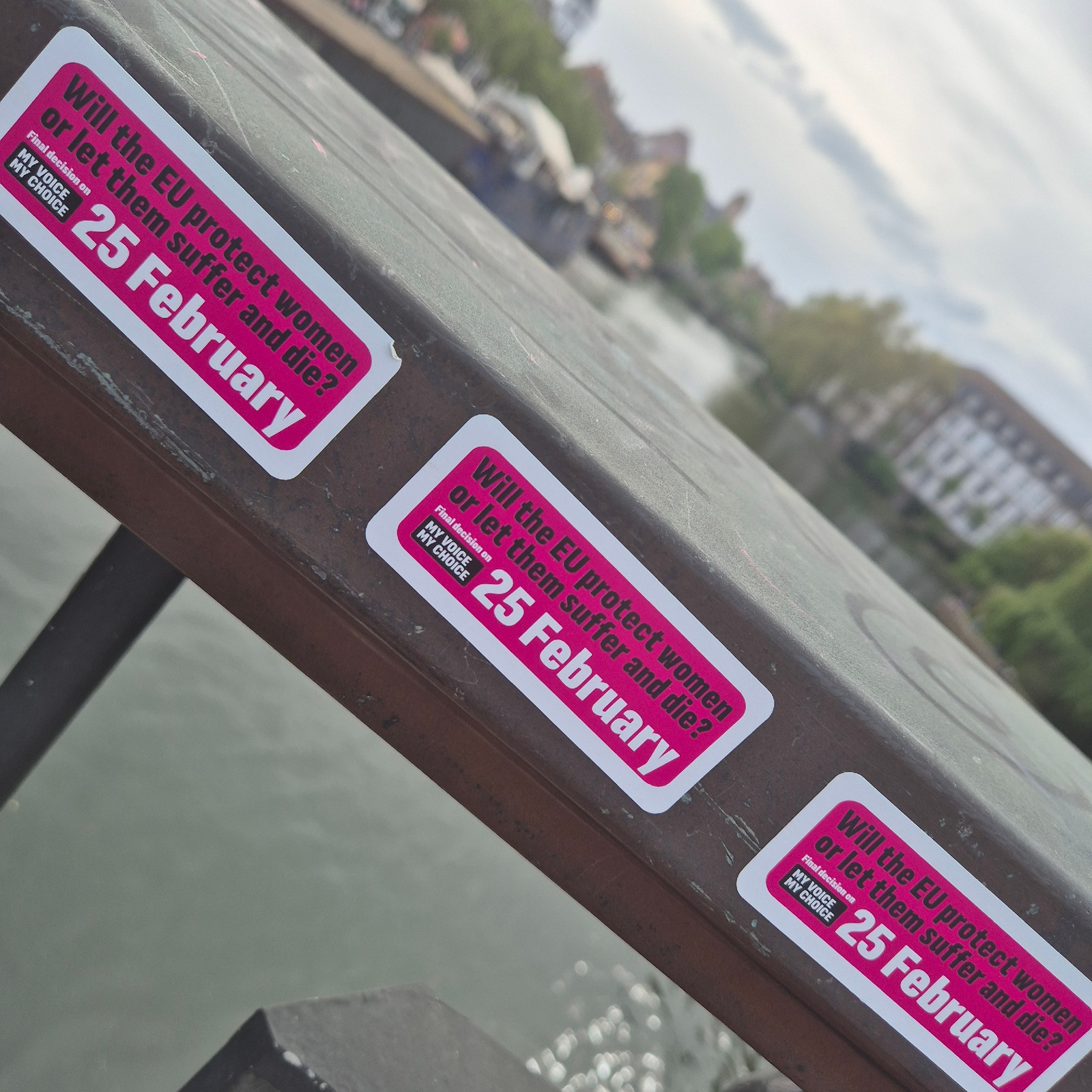 The image shows three stickers affixed to a weathered metal railing. The stickers are bright pink with white text that reads, "Will the EU protect women or let them suffer and die? Final decision on M…read more