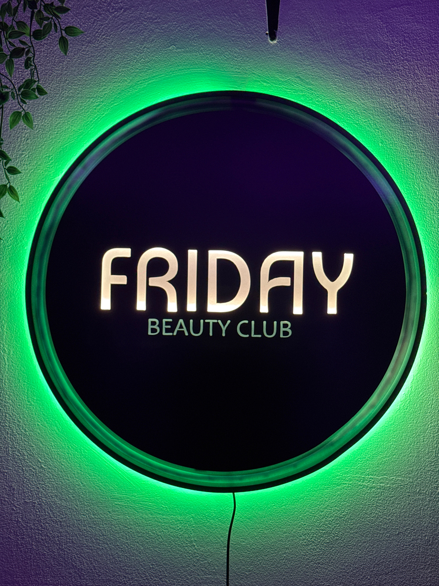 A circular, illuminated sign reading "FRIDAY BEAUTY CLUB" in vertical alignment hangs on a textured wall. The sign is backlit with green light, creating a halo effect around it. The interior of the ci…read more
