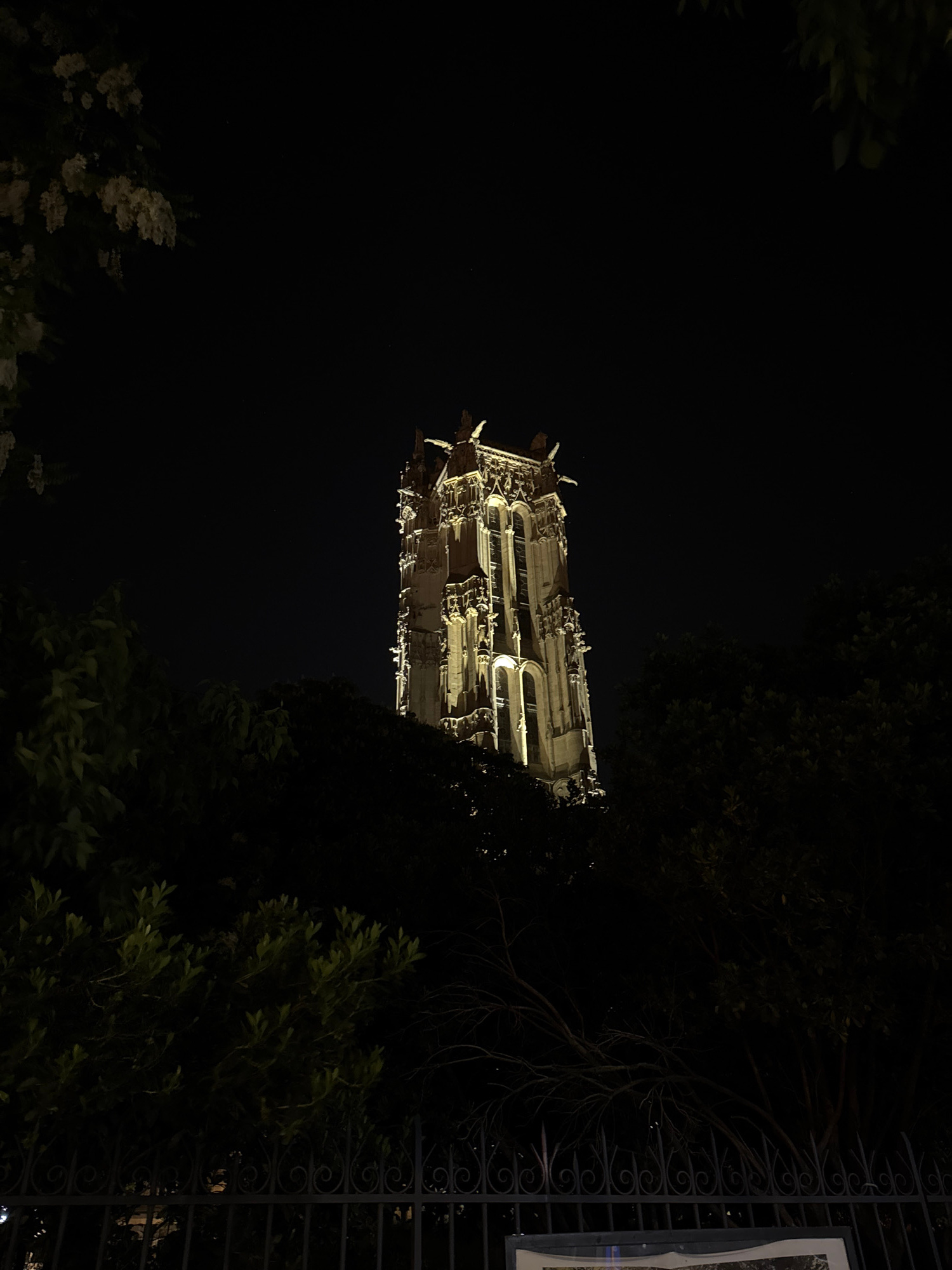 The image shows the Tour Saint-Jacques in Paris, France, at night. The tower is illuminated, contrasting with the dark sky. It's partially obscured by trees and an iron gate on the right side of the i…read more