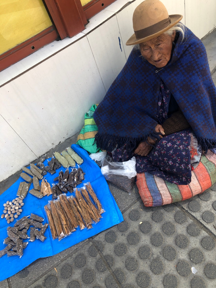 An elderly Indigenous woman is seated on a grey concrete sidewalk with circular raised patterns, positioned against a white tiled building facade featuring a brown window frame and a yellow screen, ch…read more