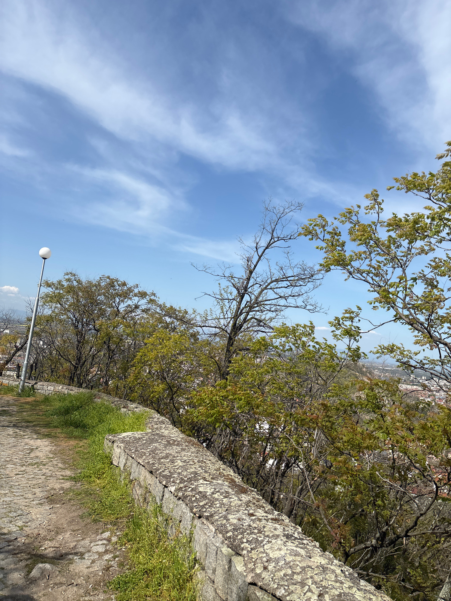 This image captures an outdoor scene on a bright, sunny day, likely from an elevated perspective overlooking a city. The upper and left portions of the frame are dominated by a clear blue sky, adorned…read more
