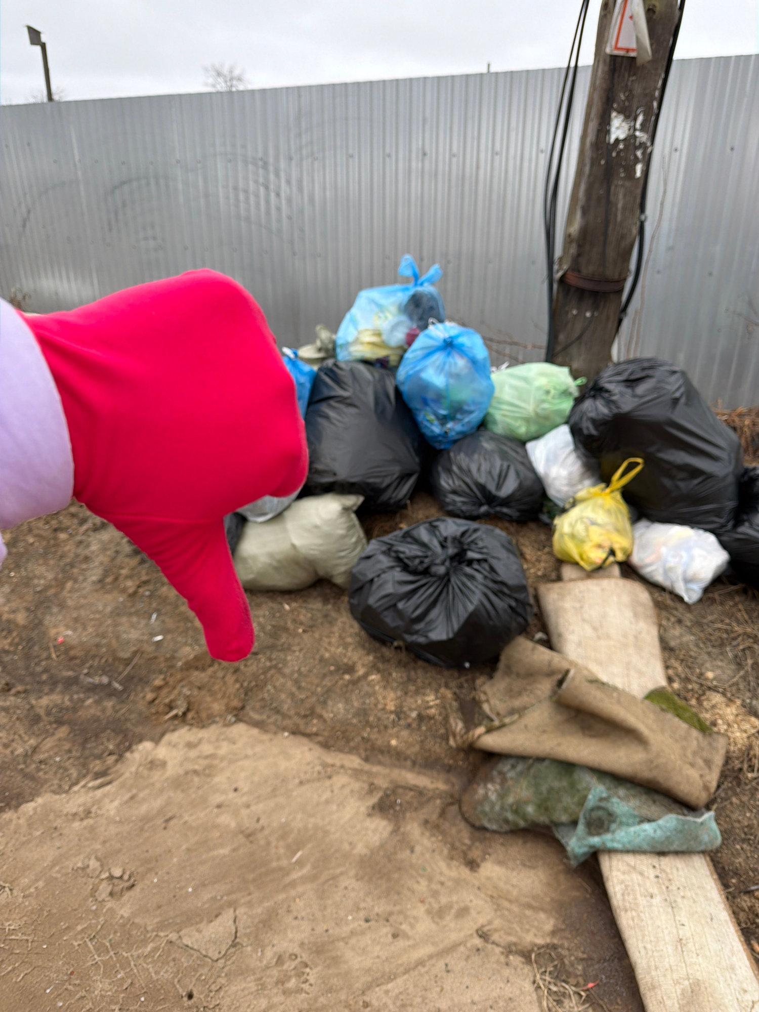 The image depicts an outdoor scene in what appears to be a neglected area. Several bags of trash, mostly black but also blue, white, and green, are piled on the ground next to a concrete surface. Ther…read more