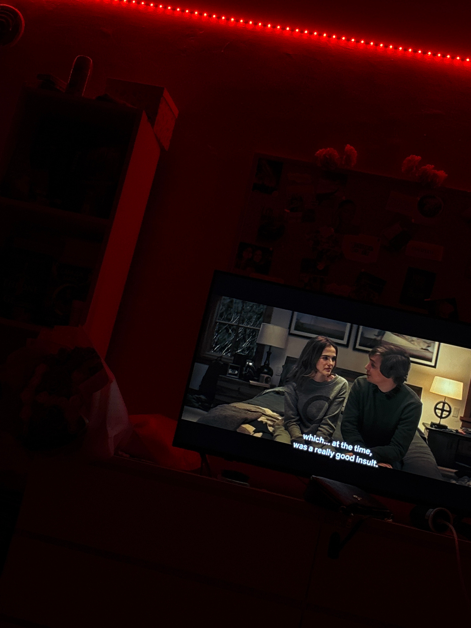 The image shows a dark room with red LED strip lights illuminating the left wall. A television displays a scene with two people, a man and a woman, seemingly engaged in a conversation. The woman is we…read more