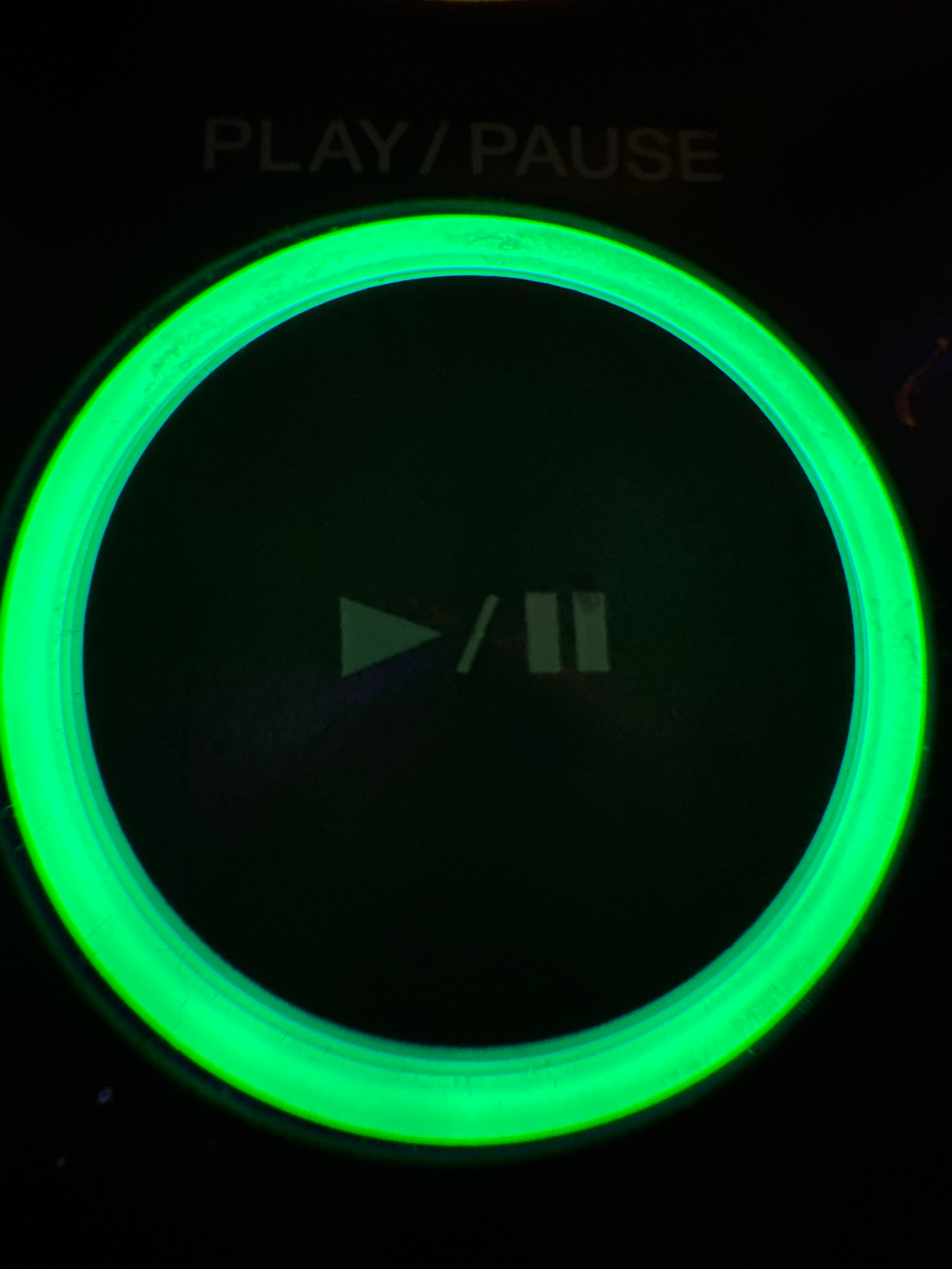 A close-up shot focuses on a circular, green backlit button labeled "PLAY/PAUSE" situated on a dark background. The button's center displays a play/pause symbol. The location is unidentifiable from th…read more