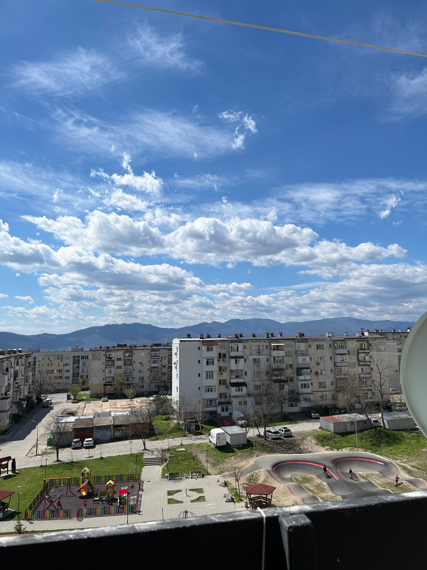 The image presents an aerial view of a cityscape in Sopot, Bulgaria. The sky, occupying a substantial portion of the frame, is a bright blue dotted with numerous white clouds. Below, a range of mounta…read more