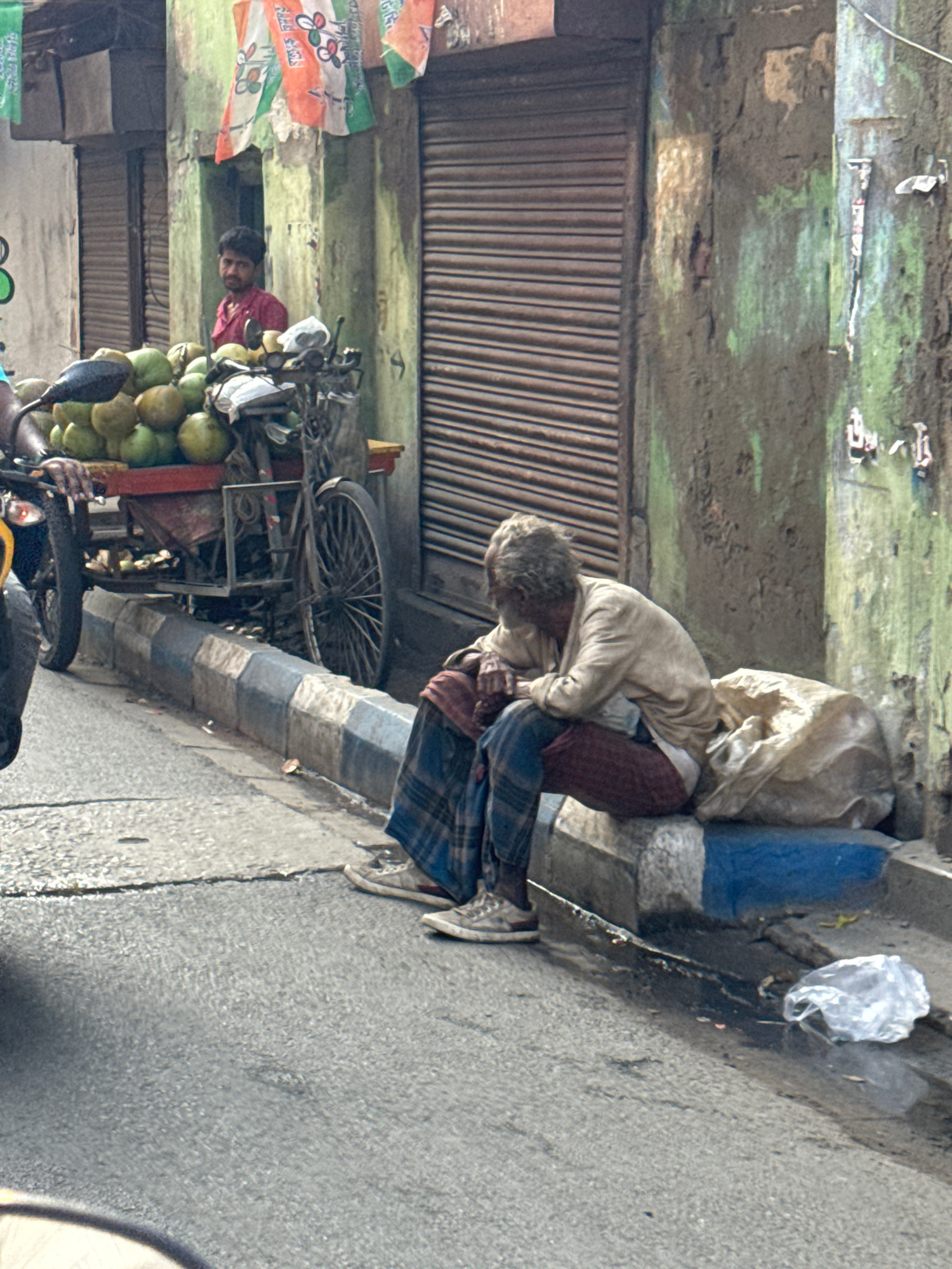 An elderly man, gray-haired and dressed in worn clothing, is squatting on the curb of a street in Kolkata, India. He wears a light-colored shirt and plaid pants. Behind him, a corrugated metal shutter…read more