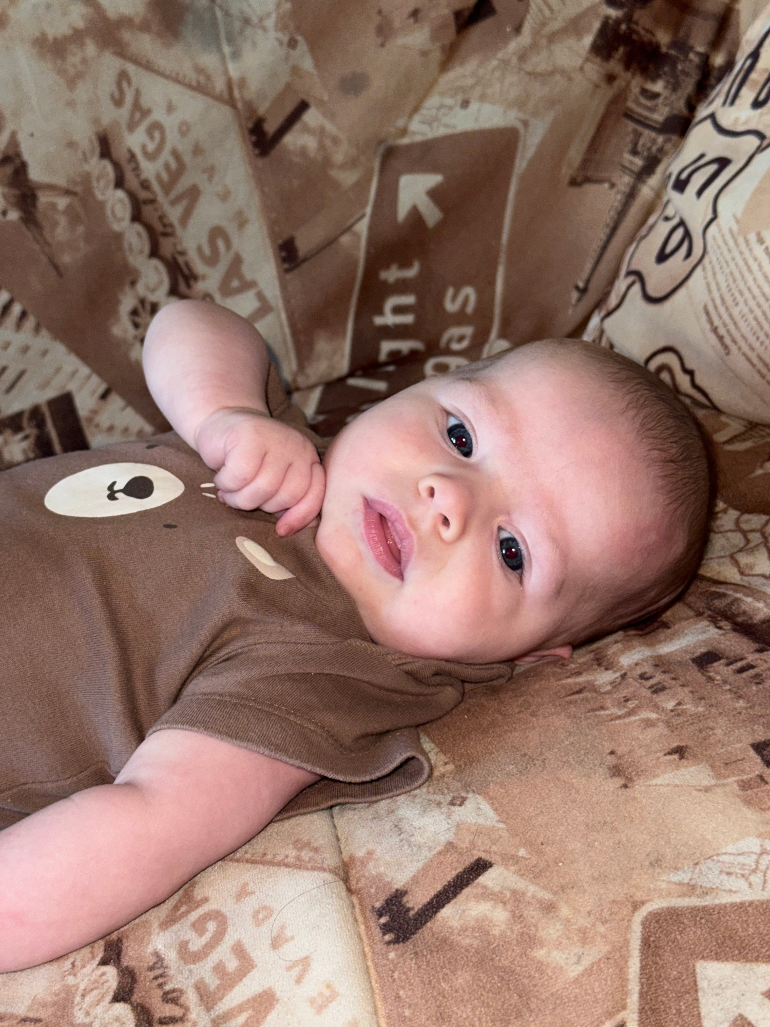 A baby lies on a brown patterned surface. The baby is fair-skinned with dark eyes and is wearing a brown shirt with a bear design. The patterned surface includes text and images, possibly depicting a city such as Las Vegas, Nevada. The location and the city of Chaikovsky, Russia, are not evident in this image. | Open Wire