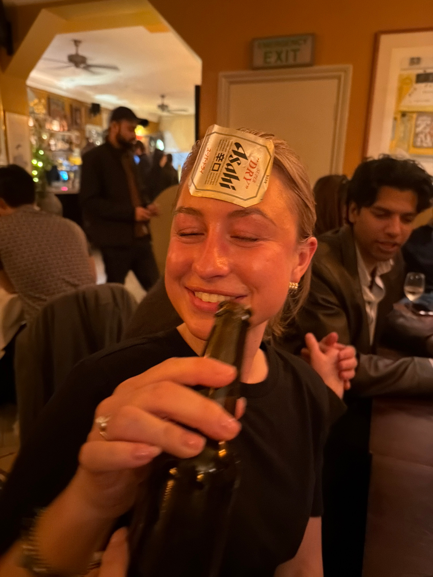 In a dimly lit interior scene, a smiling woman with a beer label on her forehead holds a dark bottle in her hands. She is wearing a dark top and a ring. Behind her, another person is lying down, dress…read more