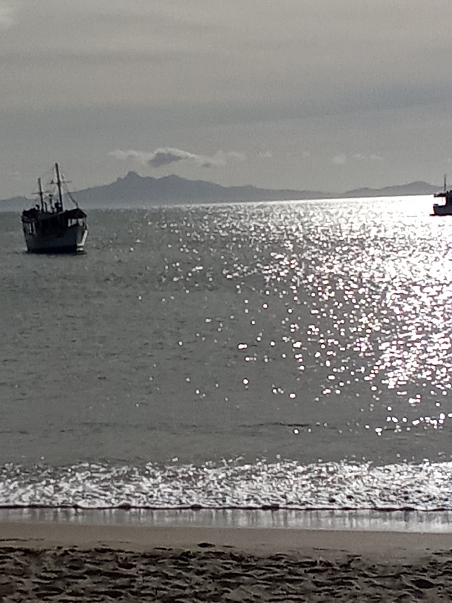 The image depicts a coastal scene in Juan Griego, Venezuela. A body of water, likely the Caribbean Sea, dominates the view, with sunlight reflecting off its surface. A fishing boat is anchored to the…read more