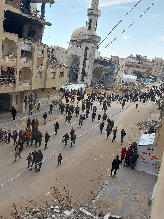 The image captures a wide street in Khan Yunis, Palestinian Territory, presenting a scene of extensive urban destruction amidst civilian activity. In the background, a prominent mosque with a light-co…read more