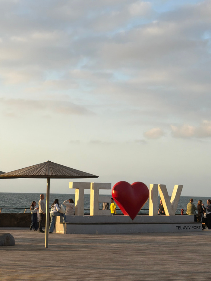 "I love TLV" sign in Tel Aviv Port, featuring a red heart. The sign stands along a boardwalk with people gathered nearby. A black parasol-like structure stands in the foreground. In the background, a…read more