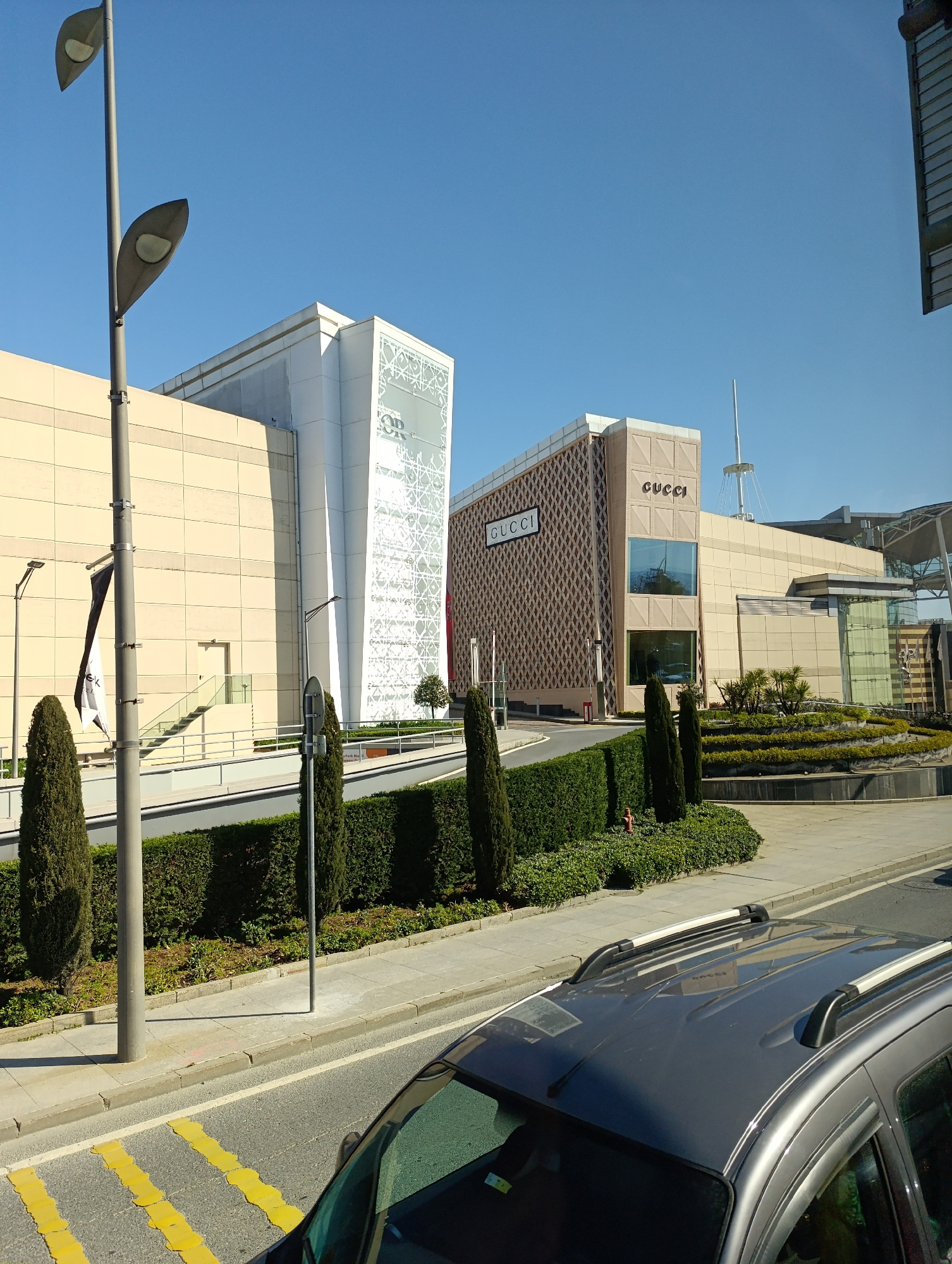 The image captures a scene in Sarıyer, Turkey, featuring commercial buildings against a clear, blue sky. The primary focus is on two distinct architectural structures: one with a beige facade and a ta…read more