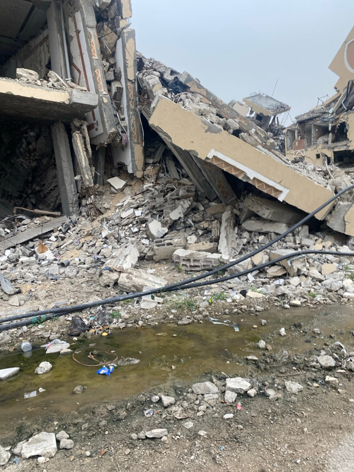 The image displays a scene of widespread destruction, likely the aftermath of a significant event such as an earthquake, bombing, or demolition. The primary focus is a severely damaged multi-story bui…read more
