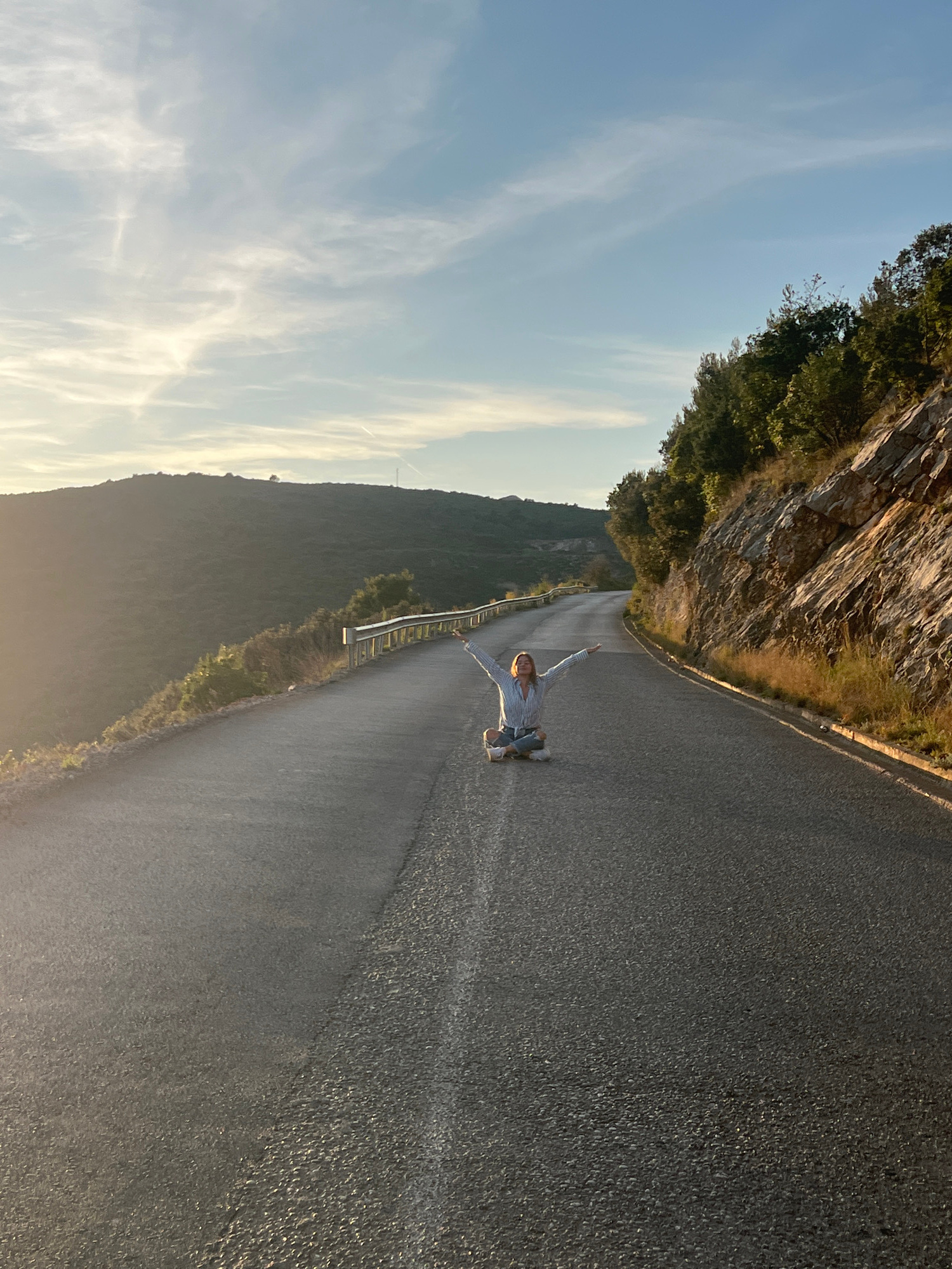 A woman stands in the middle of an asphalt road with her arms outstretched. The road curves through a mountainous landscape. On one side of the road is a steep, rocky hillside covered with trees and s…read more