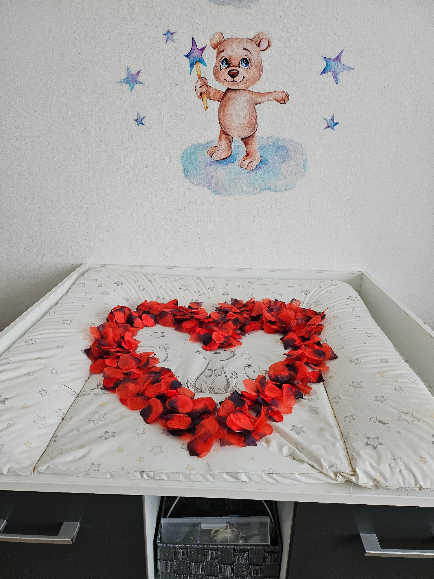 A close-up indoor shot shows a white wall on the left with watercolor art depicting a bear holding a star wand and sitting on a cloud, accompanied by several scattered stars. To the right, a baby chan…read more