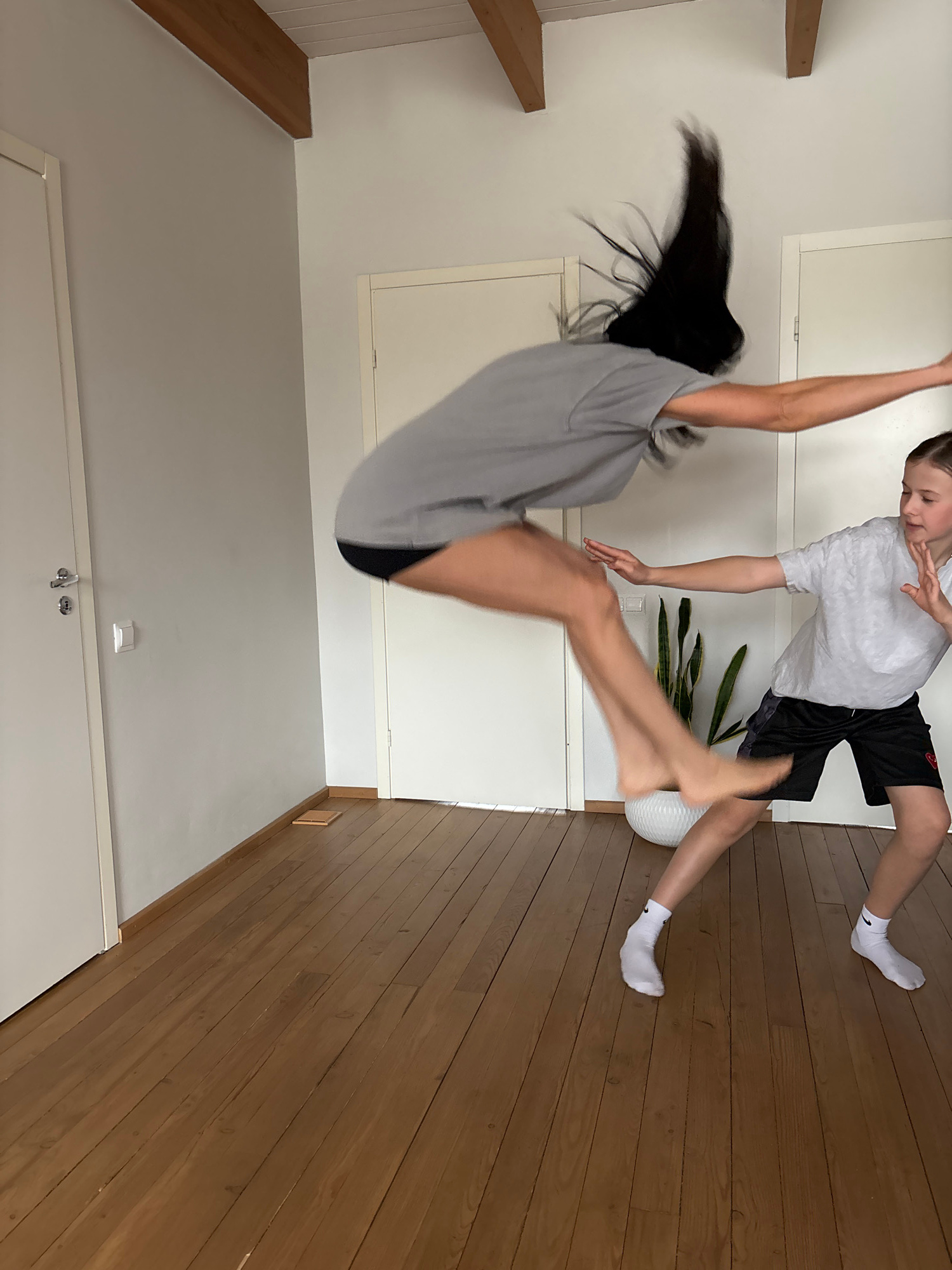 Two people are in the interior space of a building. One person with long dark hair, wearing a gray shirt and black shorts, is mid-air, performing a flip. The other person, with shorter hair and wearin…read more