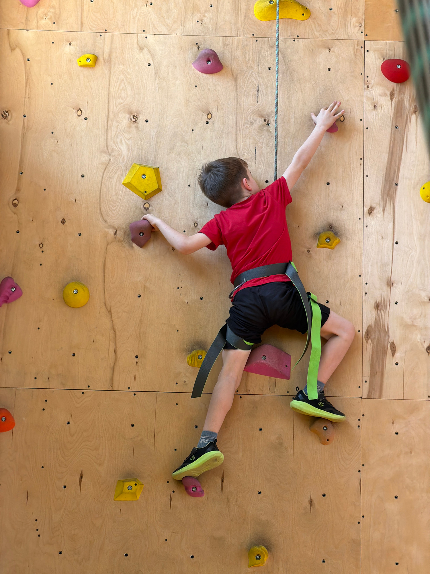 A boy in a red shirt and black shorts is climbing an indoor climbing wall. He is wearing climbing shoes and a safety harness with green straps. The climbing wall is made of light-colored wood panels w…read more