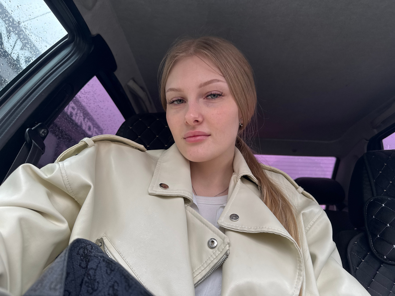 The image shows a young woman, likely in her late teens or early twenties, captured in a close-up portrait within a car in Perm, Russia. She is looking directly at the camera with a neutral, calm expr…read more