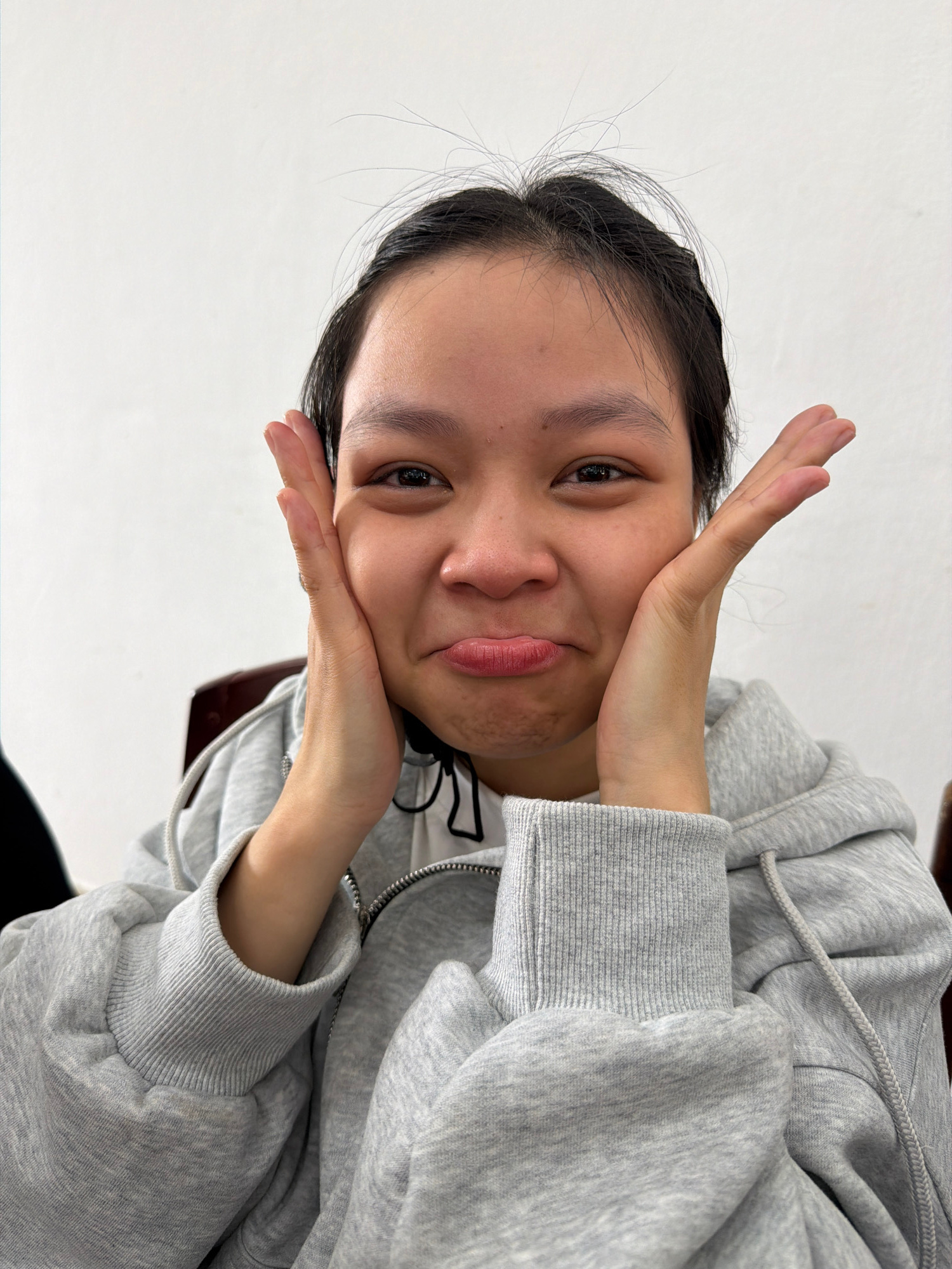 A young woman with dark hair pulled back from her face is seated, wearing a gray hooded sweatshirt. She is holding her hands on either side of her face, palms inward, as if making a "cute" pose. The b…read more