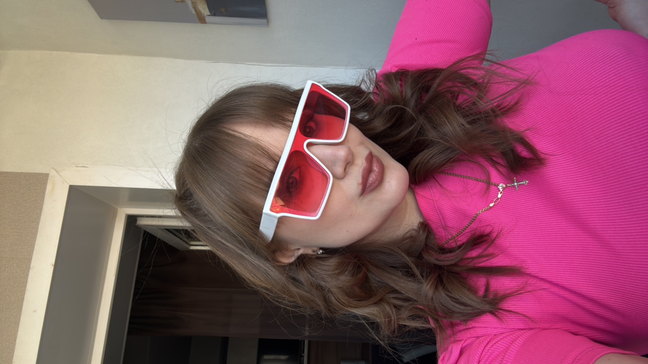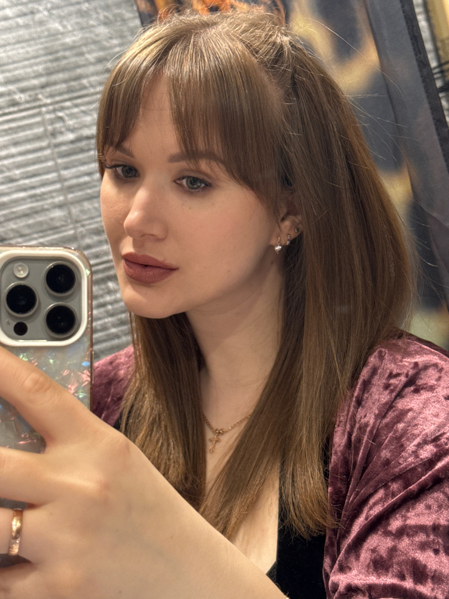 A young woman is taking a selfie. She has brown hair and is wearing a pink velvet top. She is holding an iPhone with three cameras. She is wearing a gold ring on her finger and a gold necklace. Her lo…read more