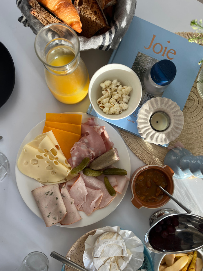 An overhead shot captures a vibrant and inviting meal spread across a white tabletop, likely for breakfast, brunch, or a casual lunch. Natural daylight illuminates the scene from the left, casting sof…read more