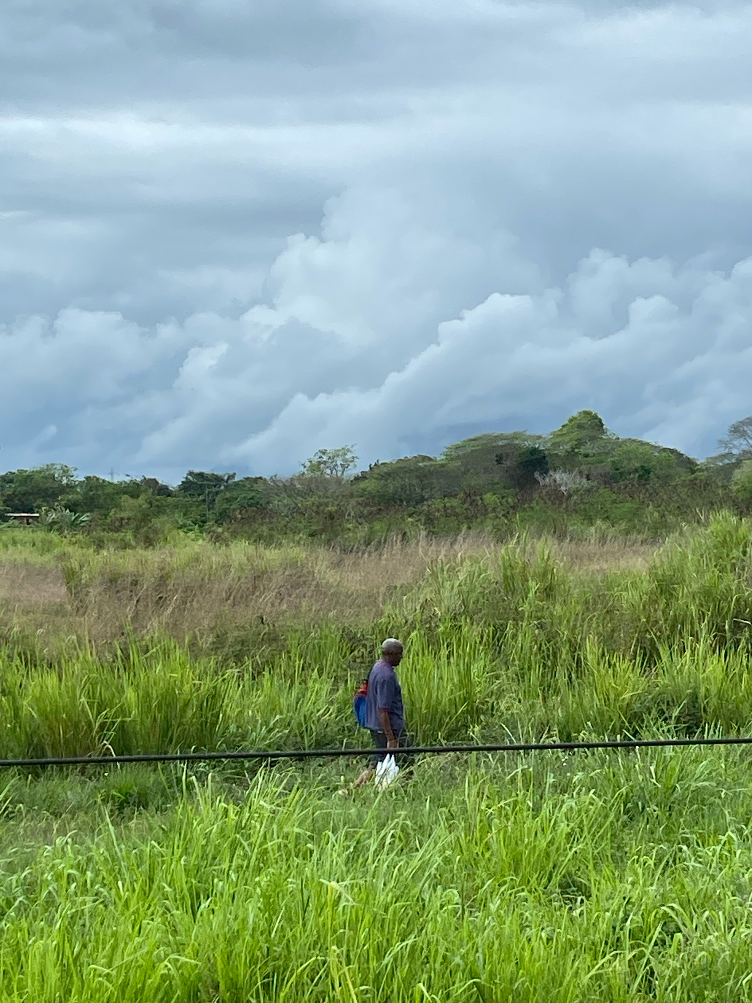 The image captures a landscape in San José de Barlovento, Venezuela. Lush green grass dominates the foreground, contrasting with a dirt path leading toward a hill covered in trees and greenery. A sing…read more