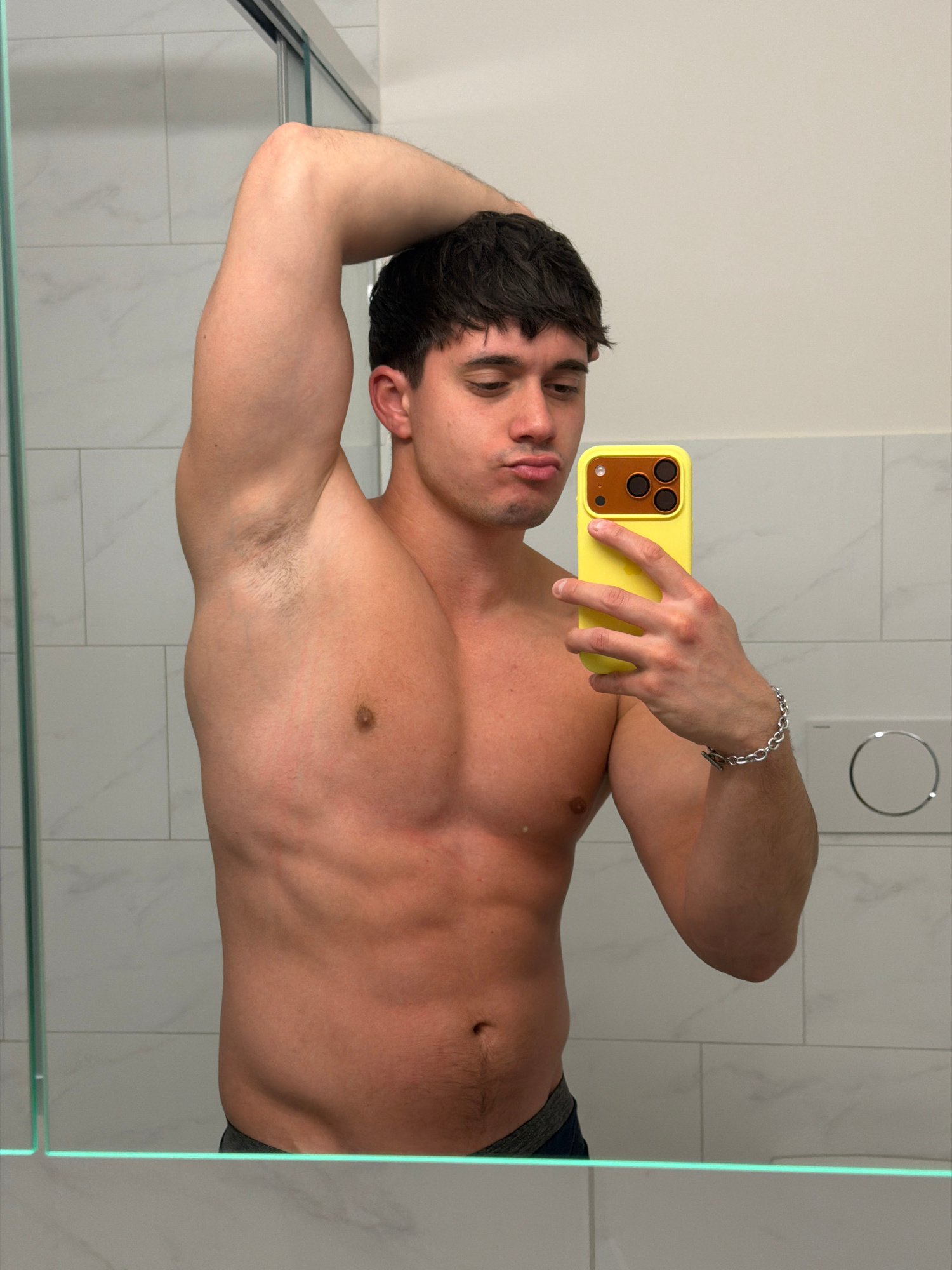 A shirtless male poses for a selfie in a bathroom with white tiled walls and a glass shower door. He holds a yellow phone in his right hand, wearing a silver bracelet on his right wrist. The backgroun…read more