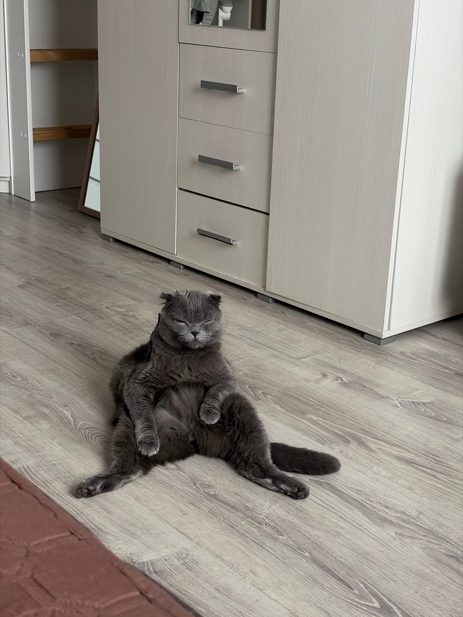 A gray Scottish Fold cat is lying on its back on a light-colored wood floor next to a white dresser in an indoor setting. The location cannot be determined.