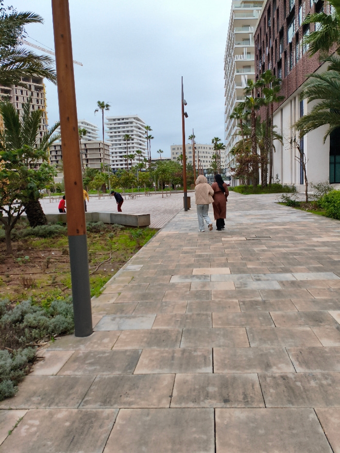 A paved walkway leads towards a park area in a city setting. Two women walk away from the camera along the path. Other people, including children, are scattered in the park. Modern buildings, some und…read more