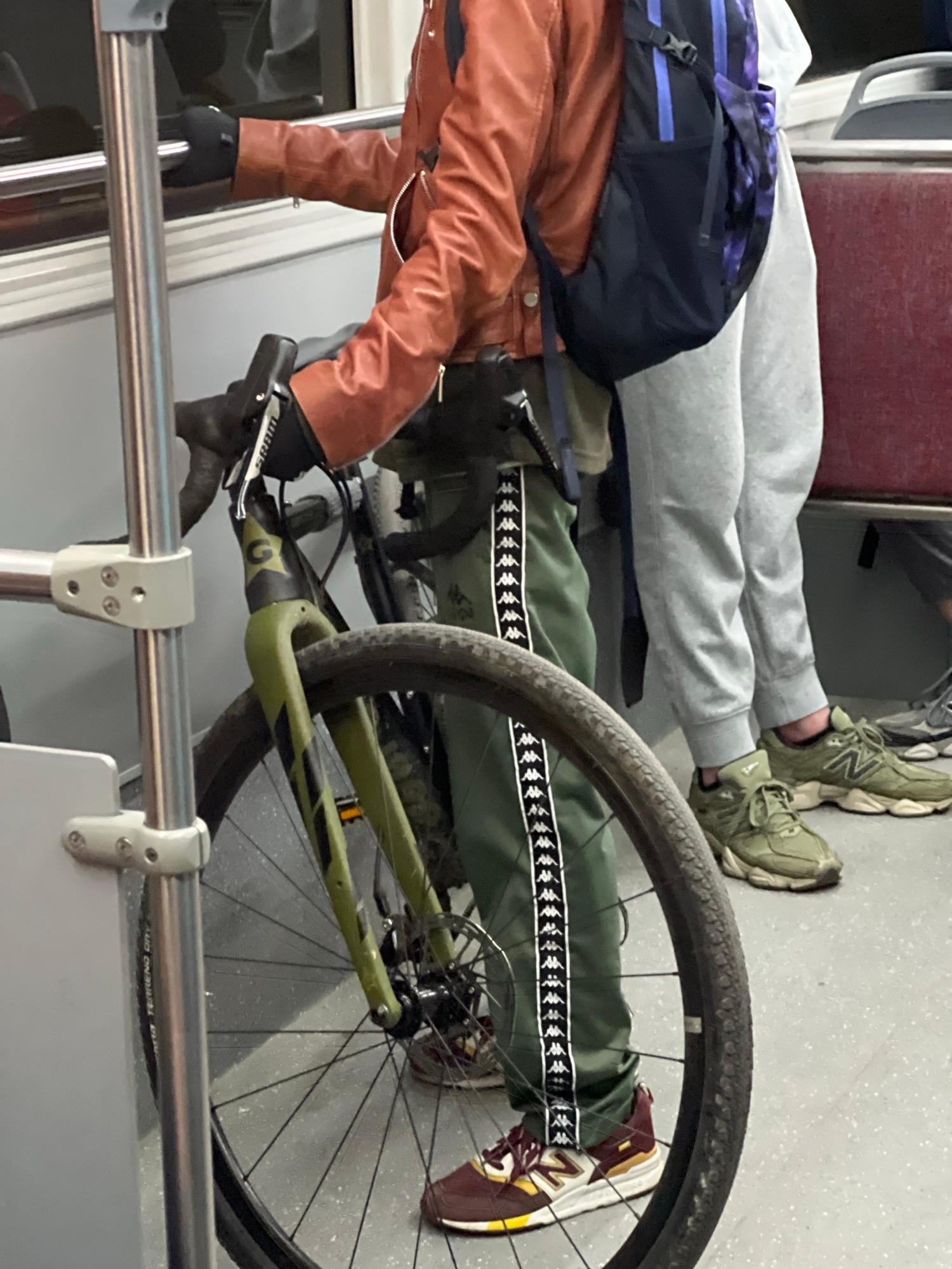 A person wearing grey sweatpants and green shoes sits in a train car. Beside them, another person wearing a brown jacket and green Kappa pants sits on the opposite side of a bicycle. The bicycle's rea…read more