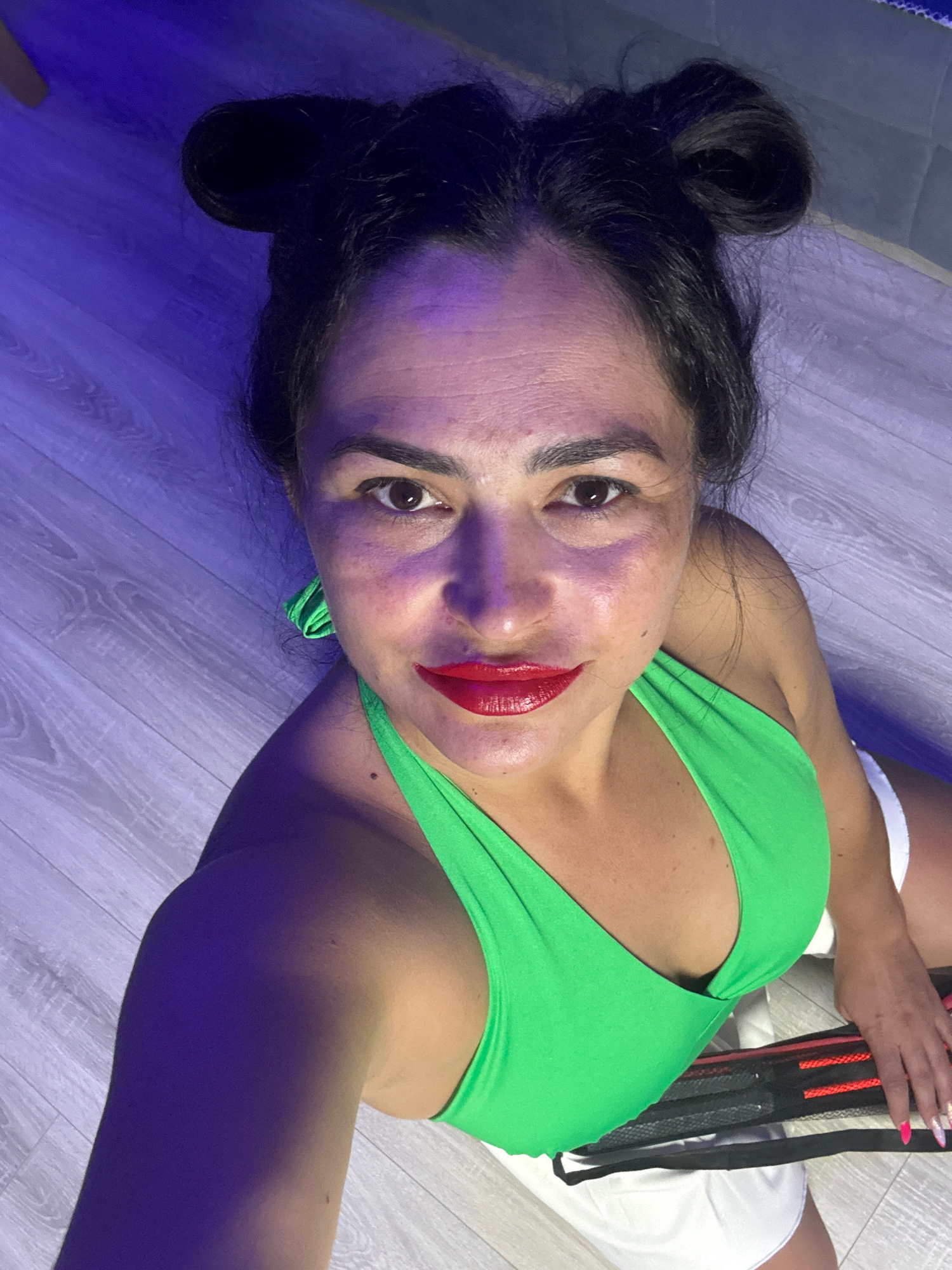 A woman is captured in a selfie-style shot, lying or sitting on a light-colored wooden floor in an indoor setting, likely in Kauchuk Stantsiya, Russia. She looks directly up at the camera with a neutr…read more