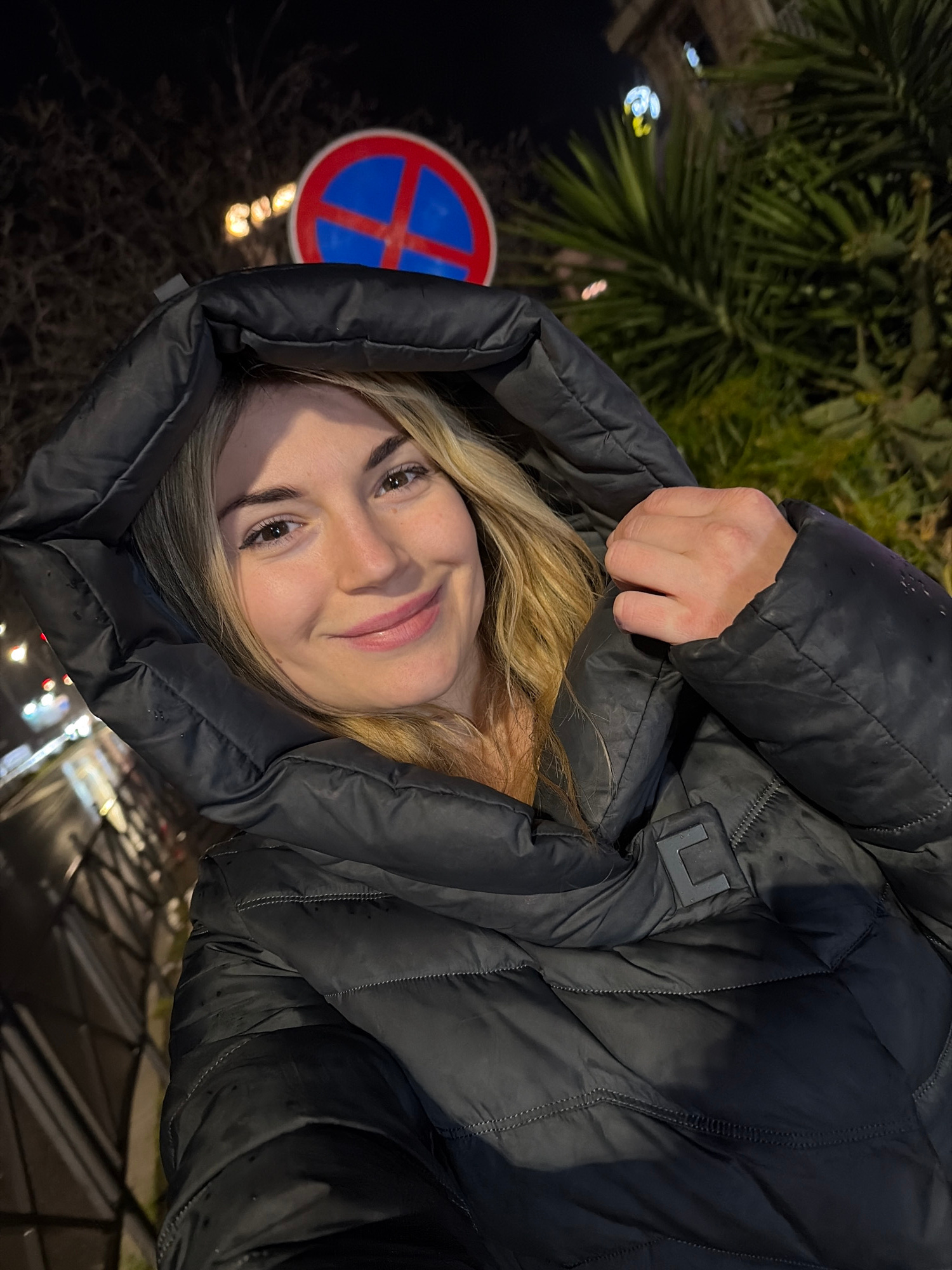 A woman with blonde hair, wearing a black puffer jacket with the hood up, is in the frame. She is smiling and looking at the camera. Behind her is a "no parking" sign with a red cross on a blue circle…read more