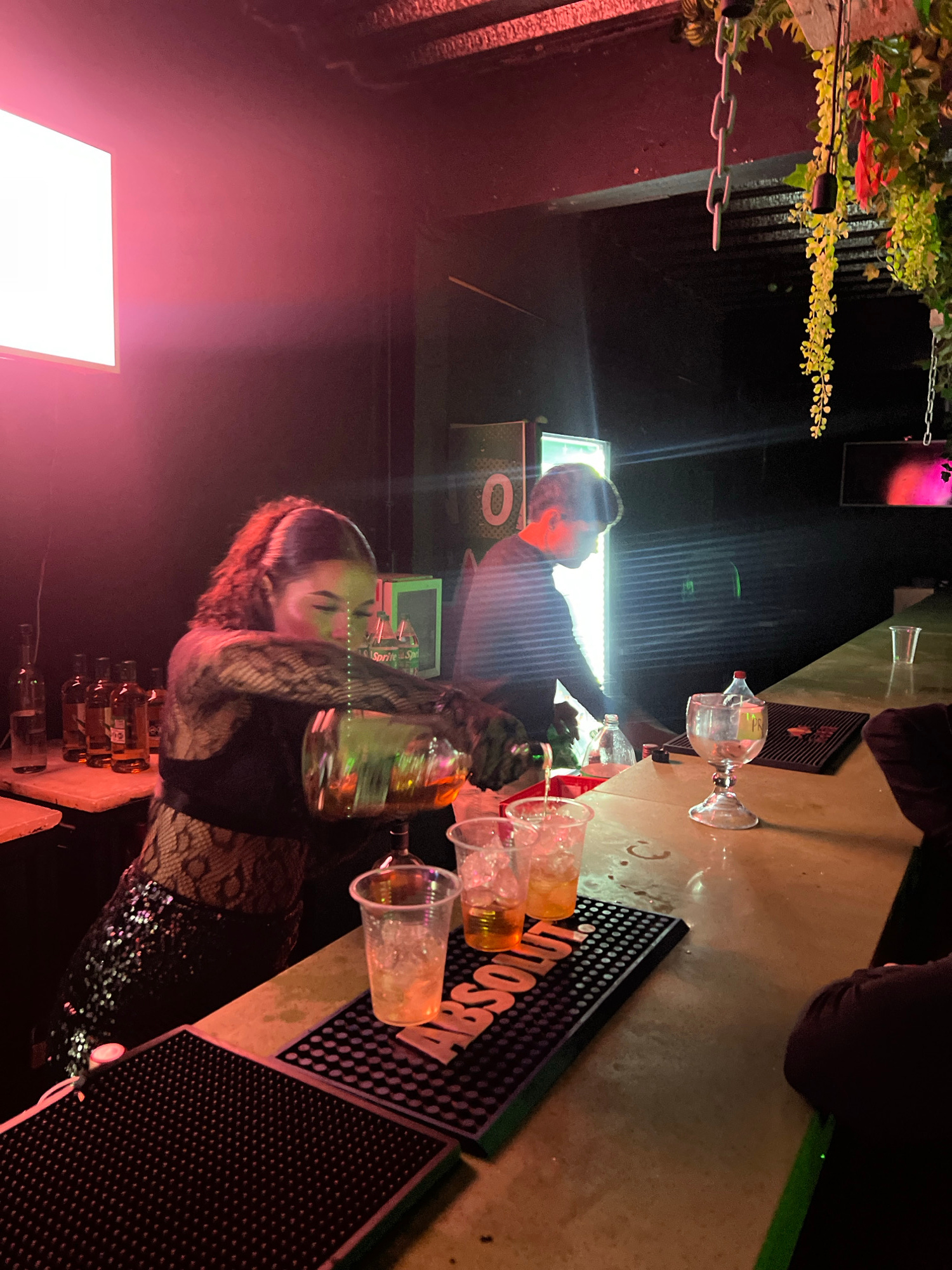 The image depicts a lively, low-lit bar scene at night in Arica, Chile, focusing on the activity behind a bar counter. The primary subjects are two individuals, likely bartenders or staff, and variousβ¦read more
